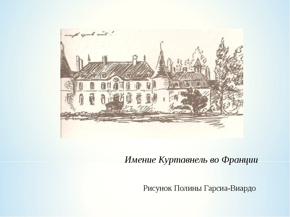 «Вы увидите наш маленький большой дом, который напоминает Ноан (поместье Жорж Санд. Н.Ч.), если б тому можно было бы придать две башенки и рвы с водой, и наш отлично распланированный парк, наши окрестности, которые, право, довольно милы» (Розанов А.С. Полина Виардо-Гарсиа. Изд. 2-е. Л.1973, с.45).