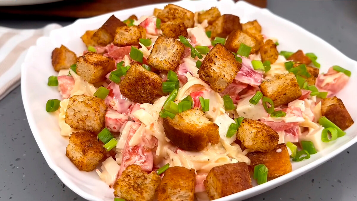 Моментальный салат на скорую руку из самых доступных ингредиентов. Салат с крабовыми палочками и сухариками можно собрать слоями и подать на праздничный стол или просто приготовить в обычный будний день к семейному ужину или обеду. Получается вкусно, сочно, нарядно и недорого. Ингредиенты ✔️Помидор - 3 шт