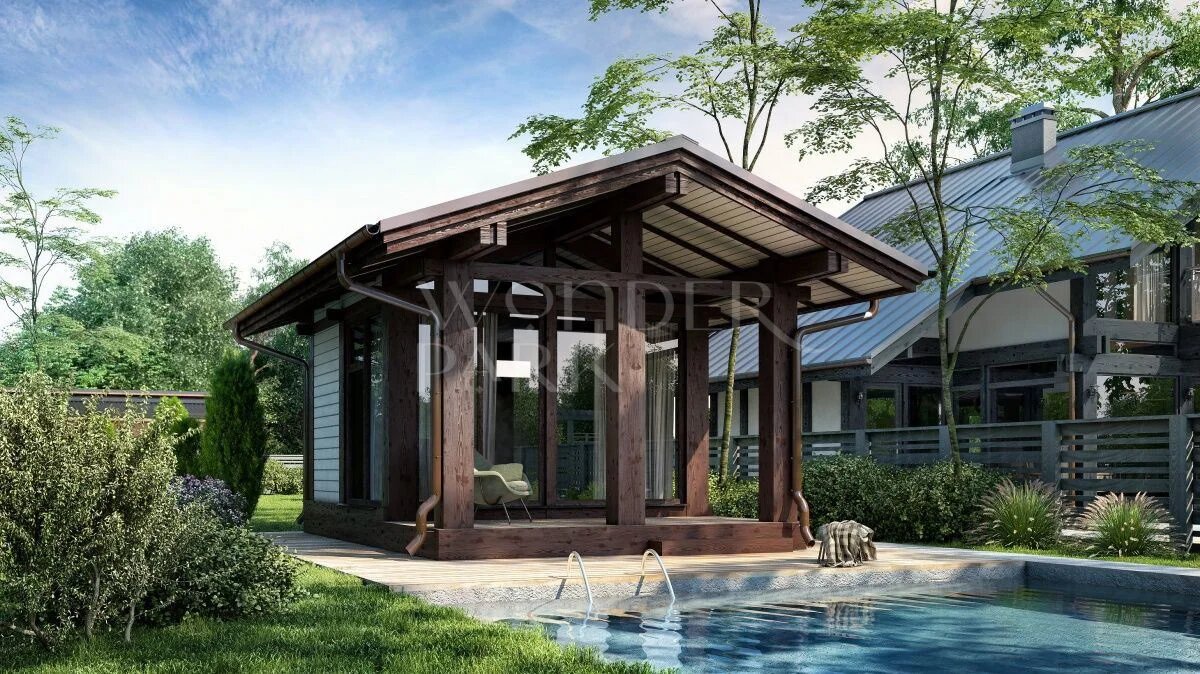 Проект современной бани в стиле с фахверк. Несущий каркас выполнен из клееного бруса, стены утеплены и отделаны деревянной отделкой. Отличительной особенностью стиля фахверк - панорамные стеклопакеты установленные без рамы в несущий каркас.