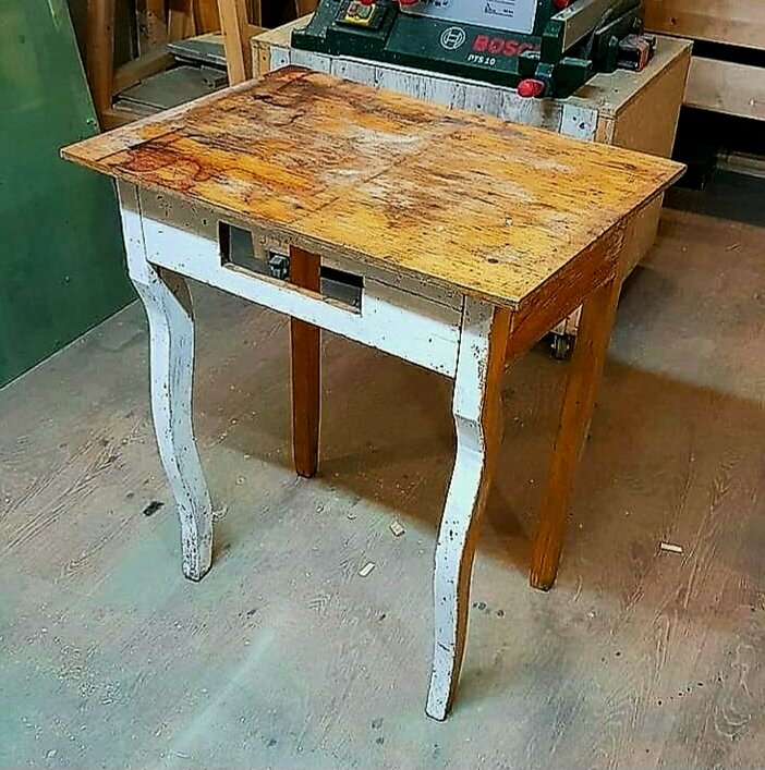 Наверное у многих из вас имеется такая мебель, либо в чулане, либо в гараже, которую "рука не поднимается" выкинуть, но и в дом не занесёшь. У кого-то это бабушкин буфет, у кого-то старый столик, сделанный еще дедушкой в молодости. У каждой такой мебели своя история, и многие хотят её сохранить на память. Я не раз перебирал, буквально по "щепкам", буфеты, комоды. Об этом я обязательно напишу. Сейчас я хочу вам показать вот этот столик. Владельцам он достался от бабушки и был дорог, не смотря на то, что он не очень хорошо сохранился. Увидев его, я сразу понял, что нужно сделать. Разобрав на части, зачистил от старой краски. Склейл, изготовил новую столешницу и ящик из дуба. Все это покрыл эмалью и маслом. Вот такая красота получилась!😊