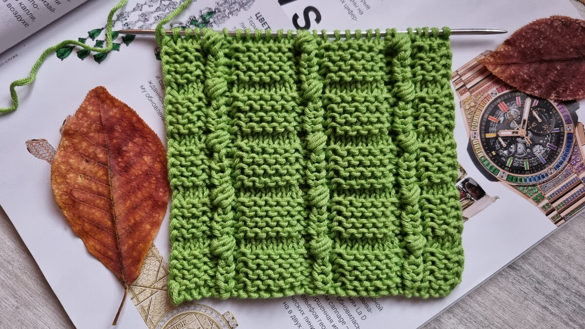 Такой узор с выразительными линиями деления мы точно ещё не вязали. А созданы они на основе простой жемчужной резинки. И конечно большая часть отдана платочной вязке.