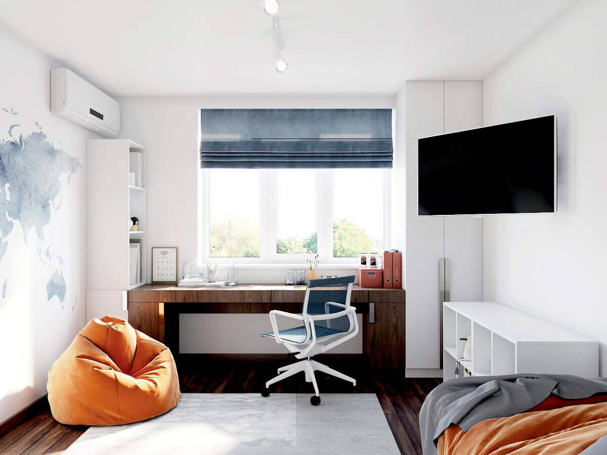 Детская комната для мальчика в современном стиле. Смотрите по ссылке Рабочая зона в детской спальне получилась яркой и стильной. На фоне светлых стен очень четко выделяется письменный стол из натурального дерева. Темно-коричневая дизайнерская мебель создает красивый контраст белоснежному стеллажу слева от столешницы. Для учебного места дизайнеры не использовали декоративных украшений, поэтому ничто не будет отвлекать ребенка от домашних заданий. Второй, более низкий и компактный стеллаж также расположен рядом с рабочей зоной. Но квадратные полочки мебели для мальчика больше подойдут для хранения игрушек, журналов и личных вещей, чем для учебников. Над системой хранения как раз хватило свободного места для телевизора. Его будет очень удобно смотреть прямо с кровати. Уютным и красочным получилось спальное место. Кровать с мягкими спинками разместилась между стеной и белоснежным шкафом. Эта своеобразная ниша делает мебель для детской комнаты более уютной. Ребенку понравится не только стил