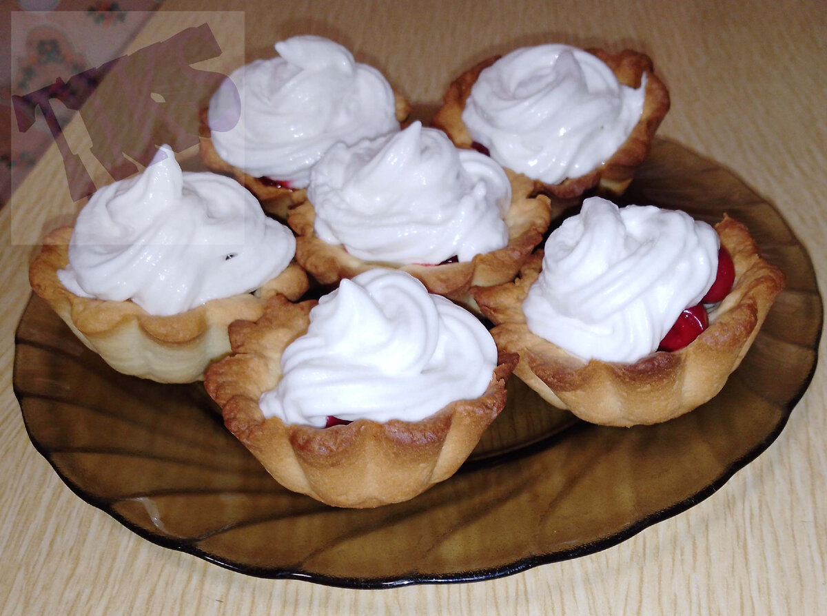 Всем добра и солнечного настроения \(⌒▽⌒) У меня для вас новый рецепт пирожных (◕‿◕)♡ Их калорийность всего 360 ккал (БЖУ 5/16/50). Нежное песочное тесто, сладкий воздушный крем и легкая вишневая кислинка... МММ 🤤 Что может быть лучше ?! Нам понадобится: Сначала нужно замесить тесто. Для этого масло заранее достаем из холодильника, выкладываем в миску, где будем смешивать его с другими ингредиентами, и оставляем при комнатной температуре до размягчения. Обычно это занимает 30 минут. Мягкое масло взбиваем миксером. Отделяем желтки от белков. Я делаю это так. Узкой стороной поворачиваю яйцо вверх и ударяю по нему ножом, чтобы получилась трещина, как на фото. Аккуратно пальцами слева и справа отламываю небольшие кусочки скорлупы. Получается небольшое отверстие. Оно не дает желтку выскользнуть, благодаря чему белок спокойно отделяется. Яйцо вращаю в по кругу, ускоряя процесс. Желтки кладем в масло. Туда же отправляем 140 г сахара. Еще раз взбиваем. Теперь мука. Добавляем ее постепенно. С
