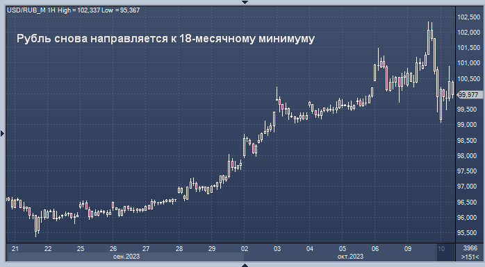 Высокий спрос на валюту сохраняется Курс доллар/рубля на Мосбирже интервалами в 1 минуту Курс доллар/рубля на Forex интервалами в 4 часа Российский рубль упал до отметки 101 по отношению к доллару во вторник, вернувшись к более чем 18-месячному минимуму, достигнутому на предыдущей сессии, под давлением внутреннего спроса на иностранную валюту и падения цен на нефть. В 07:43 по Гринвичу рубль был на 1,2% слабее по отношению к доллару и составлял 100,48. В понедельник он упал до самого слабого уровня с марта 2022 года на отметке 102,3450. Он потерял 1,3%, торгуясь на отметке 106,12 по отношению к евро, и снизился на 1,2% по отношению к юаню до 13,74 . "Если поступят большие объемы (валюты) на продажу, как вчера, во второй половине торгов, рубль может укрепиться к концу дня", - говорится в примечании аналитиков Промсвязьбанка. Рубль резко укрепился в конце предыдущей сессии. Вот что писал Интерфакс по этому поводу:"Как отмечают эксперты "Интерфакс-ЦЭА", рубль сумел отыграть утренние потер