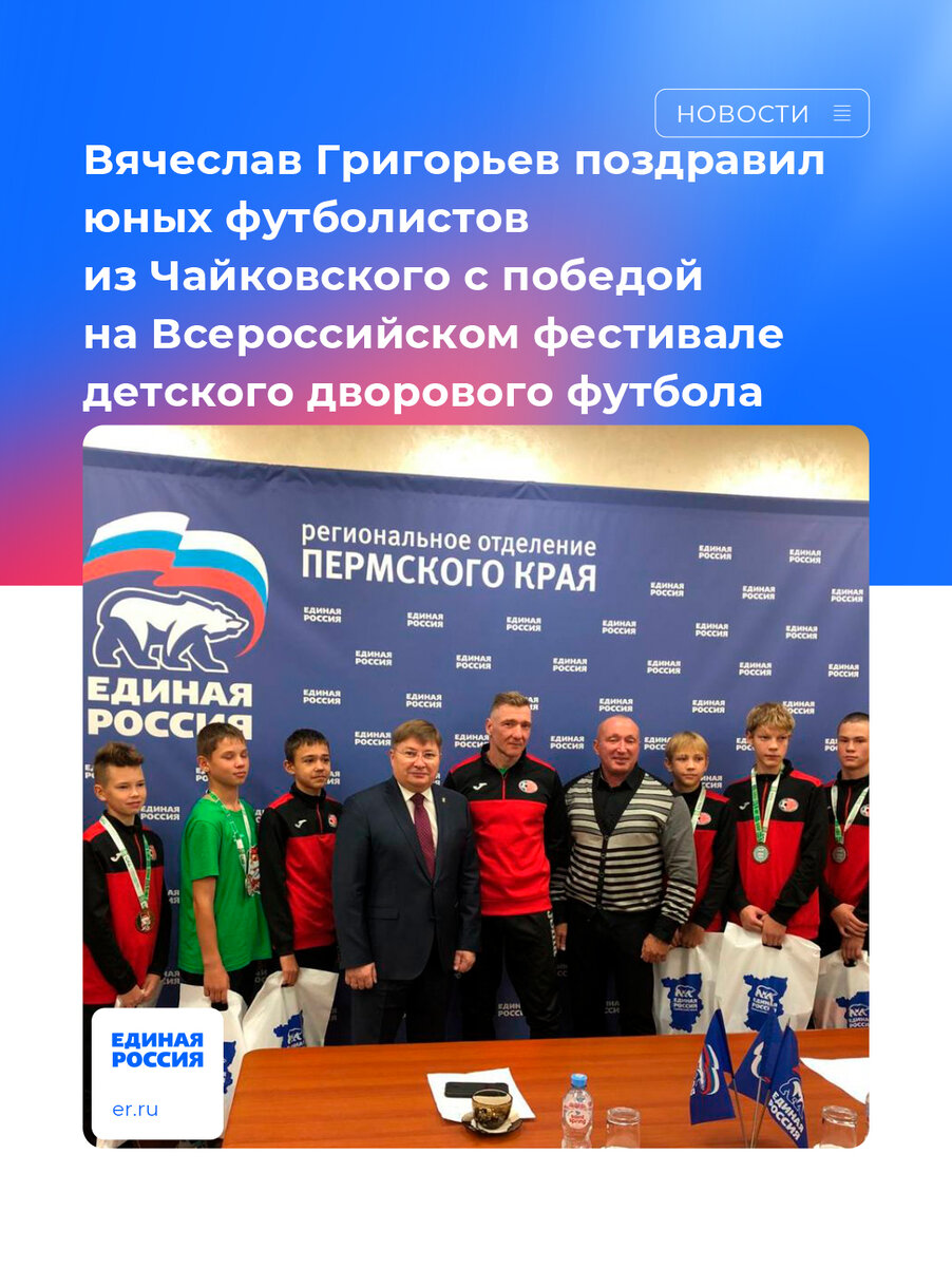 Сегодня, 10 октября, секретарь регионального отделения партии «Единая Россия» Пермского края Вячеслав Григорьев и региональный координатор партийного проекта «Детский спорт» Василий Кузнецов встретились с юношеской футбольной командой из Чайковского и поздравили их с победой на Всероссийском фестивале детского дворового футбола 6х6.