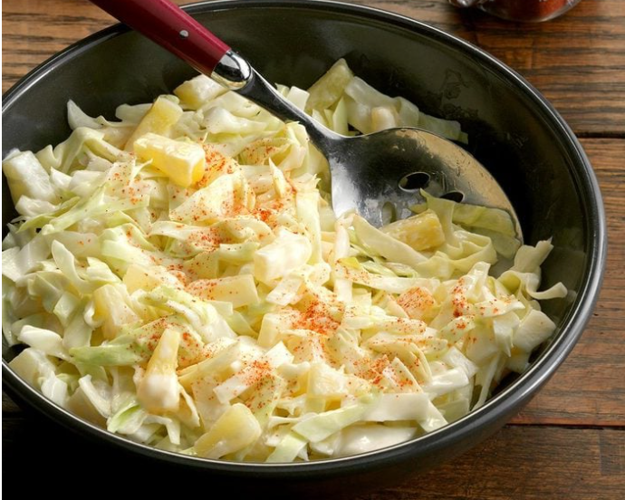 Многие пробовали пиццу с ананасом или салат из курицы и ананаса. Предлагаю вам новый салат, приготовленный всего из двух ингредиентов. Блюдо получается изысканным и вкусным. Особенно подойдет для быстрого перекуса. Ингредиенты: Приготовление Капусту необходимо тонко нашинковать и отправить в большую салатницу. Добавить соль, паприку или молотый перец, уксус и при помощи рук "жать" капусту, чтобы она стала более мягкой. Ананас нарезать на кусочки. Выложить в салат. Добавить майонез либо сметану. Хорошо перемешать. Салат готов! Блюдо получается освежающим. Если любите яркий салат, то можно добавить тертую морковь. Салат особенно оценят маленькие детки.