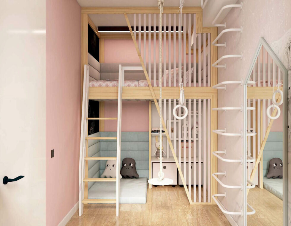 Детская комната в нежных тонах для девочки. Двухуровневая мебель и спортивный уголок для тренировок. Смотрите подробнее по ссылке Двухуровневая мебель для девочки помогла увеличить полезную площадь в этой маленькой спальне. Благодаря двухъярусной кроватке дизайнерам удалось создать в комнате не только игровую, но и спортивную зону. На первом этаже разместилась мягкая подушка, окруженная стеновыми панелями – этот комфортный уголок отлично подойдет для веселой игры или для спокойного отдыха с книгой. Хранить все свои книжки, альбомы и игрушки девочка сможет на полках аккуратного белого стеллажа. Зона отдыха становится еще уютнее, благодаря решетчатой панели, которая словно отделяет внутренне пространство двухъярусной кровати от остальной части комнаты. Обычно делать утреннюю зарядку совсем не хочется, но с такой симпатичной спортивной зоной гимнастика будет проходить веселее. Спортивная мебель для детской комнаты включает вертикальную лестницу, канат и гимнастические кольца. В этой уютно