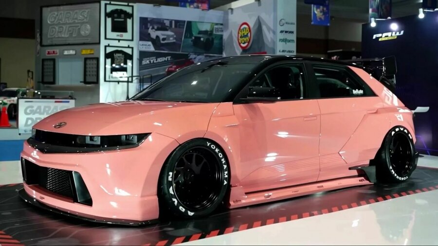 Тюнинг-ателье Coga разработало для электромобиля Hyundai Ioniq 5 яркий обвес, который можно установить даже на базовый вариант модели мощностью всего 168 лошадиных сил. Интересно, что Ioniq 5 от Coga больше не похож на кроссовер, поскольку значительные модификации визуально превратили его в хот-хэтч. По словам индонезийского тюнера, дизайн бодикита был вдохновлен уличными гонками. Особенностью этого комплекта кроме его привлекательного светло-розового оттенка являются накладки на колесные арки, которые увеличивают ширину электромобиля. Новые передние крылья идеально сочетаются с нестандартным передним бампером с большим воздухозаборником. Кроме того, комплект включает в себя передний сплиттер из карбона, аэродинамические накладки на боковые пороги и новый диффузор заднего бампера. Над задним стеклом также разместилось двухъярусное заднее антикрыло. Следует отметить, что оно может оказать негативное влияние, увеличивая сопротивление и уменьшая запас хода электромобиля. Тюнер также обору