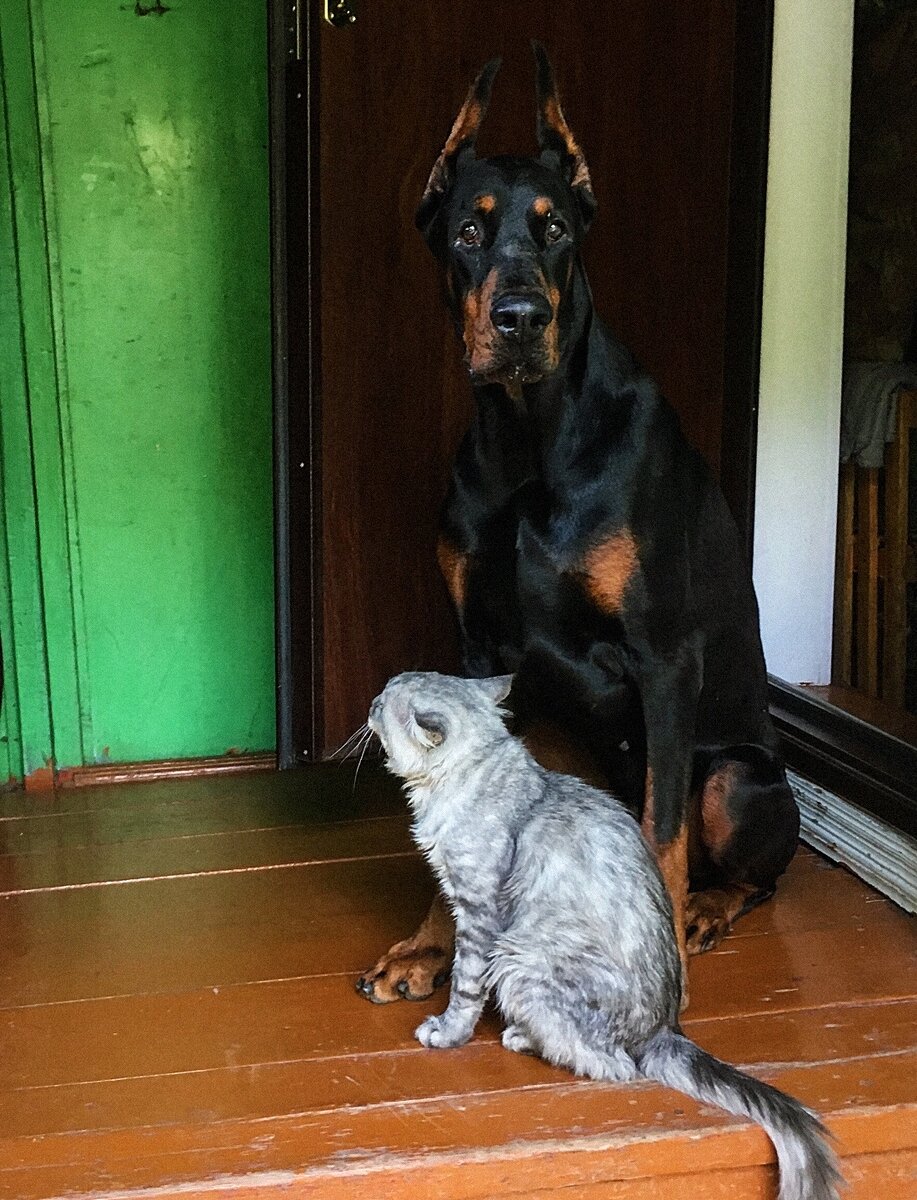 Можно ли подружить добермана с кошками? Скорее всего нет. Но это совсем не значит, что собака будет стремиться убить всё мяукающее. Просто сказывается разница темпераментов. Недавно я знакомил своего добермана Ареса с котом Пухом, проживающим в деревне. За счёт того, что Пух рос с доберманом Тамиром и не боится собак, знакомство прошло без конфликтов. Но вот соседские котики, проявившие желание познакомиться с щенком, всё же не решились и стали объектом преследования. А бегущий для добермана всегда игрушка и добыча. Поэтому , в принципе, добиться лояльности к кошкам можно, но зависит это и от кошек не меньше. От их бесстрашия и не агрессивного поведения.