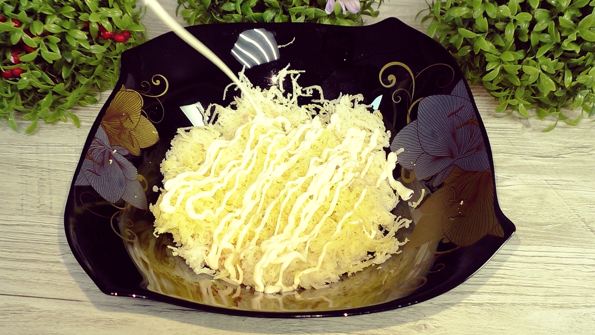 На дно салатника (тарелки) на мелкой тёрке натереть картофель, слегка посолить, я делаю сеточку из майонеза.
