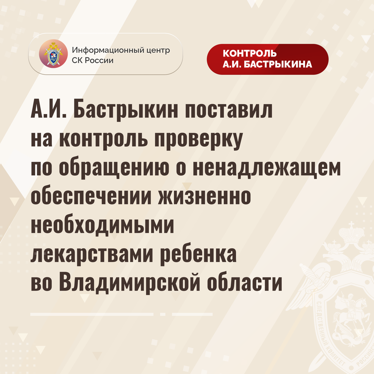 К Председателю СК России А.И. Бастрыкину в комментариях в аккаунте Информационного центра «ВКонтакте» обратилась жительница города Гусь-Хрустального Владимирской области. Она сообщила о ненадлежащем обеспечении жизненно необходимыми лекарственными препаратами ее восьмилетней дочери, являющейся инвалидом, при этом взамен предлагаются аналоги, прием которых положительных результатов не приносит и может негативно сказаться на состоянии здоровья ребенка. Родителям девочки приходится приобретать указанные медикаменты за свой счет.