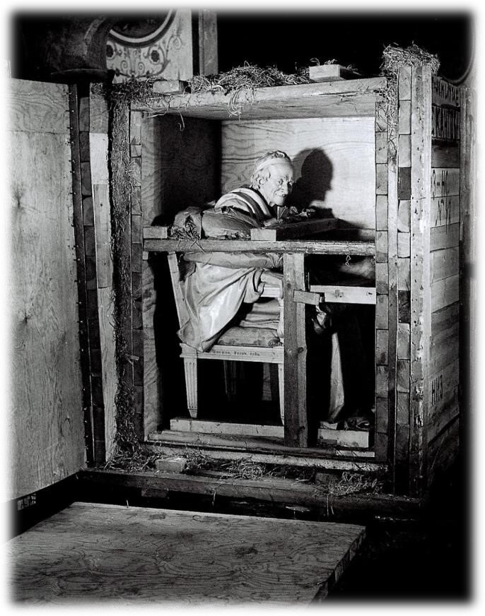 На этой неделе мы вновь публикуем исторический снимок и вспоминаем важную дату в истории музея. Эрмитаж бережно хранит память о четырех годах, проведенных сотрудниками музея в эвакуации в Свердловске во время Великой Отечественной войны. В конце июня – начале июля 1941 года два эшелона с самыми ценными экспонатами были отправлены на Урал в сопровождении научных сотрудников и реставраторов Эрмитажа. После объявления о победе советской армии в мае 1945 года началась активная подготовка к реэвакуации в Ленинград. 10 октября 1945 года эшелоны с эрмитажными экспонатами прибыли из Свердловска. Шесть подъездов музея были открыты для встречи музейных коллекций. На следующий день 11 октября газета «Ленинградская правда» сообщила о возвращении эрмитажных ценностей. На снимке запечатлена скульптура «Вольтер, сидящий в кресле» – один из шедевров крупнейшего французского мастера XVIII века Жана-Антуана Гудона. Образ создан на основе глиняных портретных эскизов, выполненных незадолго до смерти филос