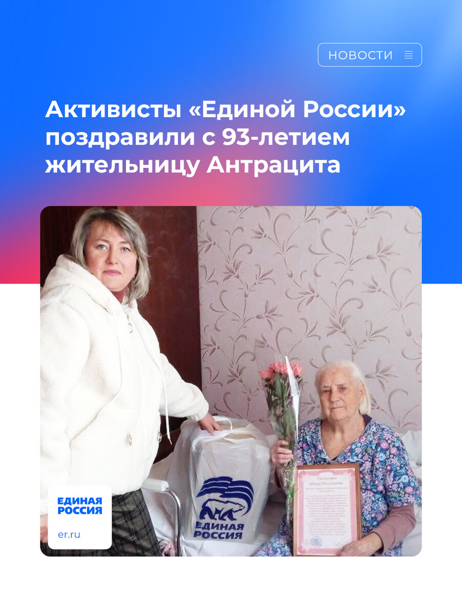 Имениннице вручили поздравление, цветы и подарок от Главы Администрации города Антрацита и Антрацитовского района, Секретаря местного отделения партии «Единая Россия» Сергея Саенко.