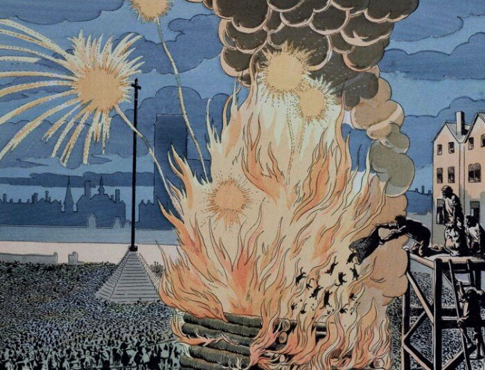 5 ноября. Этот день ассоциируется с Гаем Фоксом и его попыткой взорвать британский парламент в 1605 году. Гай Фокс и его сообщники планировали устроить взрыв с целью убийства протестантского короля Якова I, который был на троне в то время. С течением времени этот день превратился в праздник с фейерверками и сжиганием чучела Гая Фокса. Но в XVII веке, когда эта традиция только зарождалась, англичане обращали своё внимание на и других "героев" для выражения своих чувств. Папа Римский и Дьявол: Главное зло протестантов