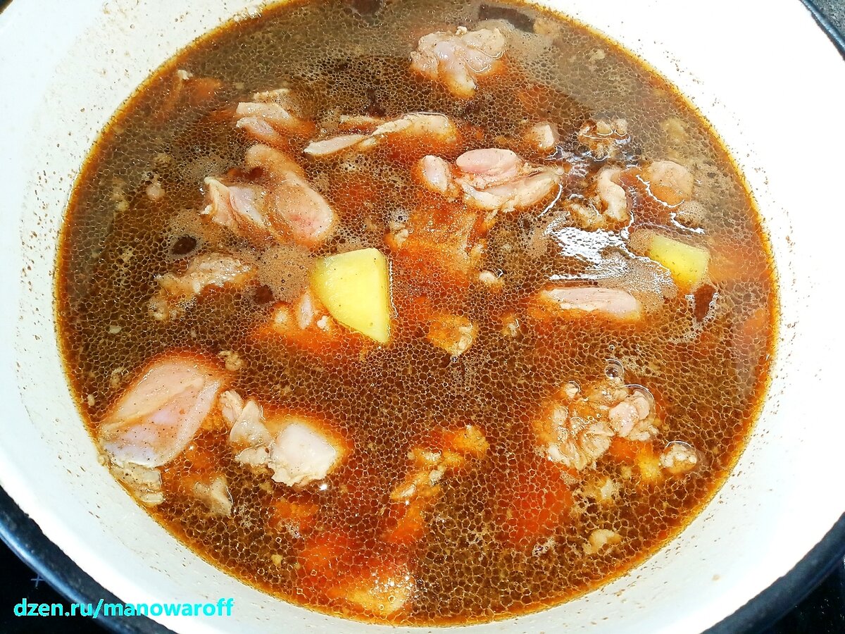 Давненько я не брал в руки поварешку. А вот сегодня взял и сбацал вкусненькое корейское блюдо, представляющее из себя что-то среднее между густым супом и жиденьким рагу. В принципе, в оригинальном рецепте в состав этого блюда входят огурцы, но, сами понимаете, надо же куда-то утилизировать кабачки. Так что я взял вместо двух крупных огурцов один небольшой кабачок. Ну а с огурцами попробую приготовить в следующий раз. Итак, для приготовления нам потребуется: Для бульона: Для маринада: Курятину нарезаем на кусочки среднего калибра, перекладываем в кастрюльку, засыпаем туда соль с перцем, заливаем кулинарное вино и оставляем мариноваться минут на 10 минимум. Кабачок чистим, разрезаем пополам вдоль, вычищаем семечки и нарезаем на средние куски (если используем огурцы, то их чистить не надо, а семечки тоже выскребаем). Картошку, морковь и лук чистим и нарезаем на средние кусочки. В кастрюлю наливаем воду, выдавливаем туда на прессе чеснок, добавляем все остальные ингредиенты для бульона, ст