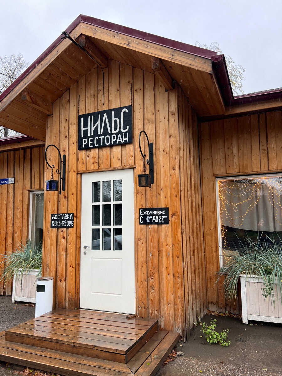 В эти выходные началась суровая осень вперемешку с зимой. Но поездку за кормом для собаки отложить было нельзя. Раз уж из дома выбрались, решили заехать пообедать неподалеку. Мы живем за городом. И самое ближайшее оказалось кафе фермерской кухни «Нильс» в Истринском районе. Это отдельно стоящее маленькое уютное заведение. Всего 5 столов в зале. Летом работает веранда, на ней столов около 10. В осеннюю погоду её почти разобрали. Единственный минус, что вход в WC через внутренний дворик. Сама уборная теплая, но в холодное время года не совсем комфортно пробегать через улицу. Помыть руки перед едой можно и в самом зале, раковину аккуратно вписали в интерьер. Посмотрела на нее и почему то не сфотографировала. Официанты вежливые. Быстро приняли заказ. Мой безалкогольный глинтвейн подогрели заново, когда он остыл. Еда по-домашнему вкусная. Из Нильса доставляют еду на дом. Можете заказать по телефону. Раньше у них было только раздаточное меню, но недавно было обновление по кухне и нов
