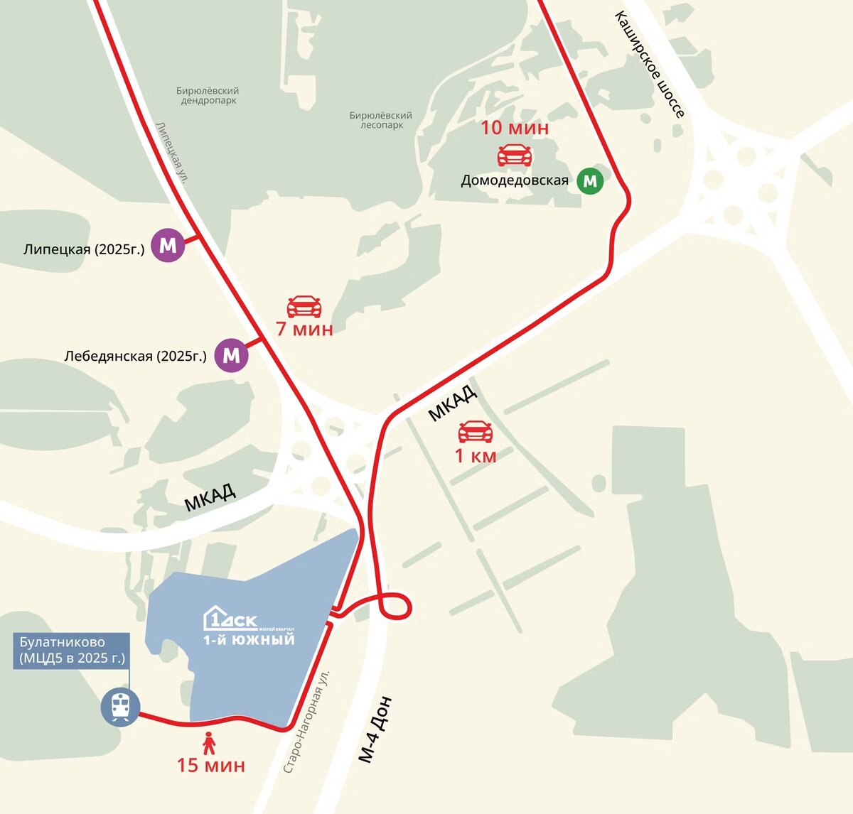 Жилой комплекс «1-й Южный» класса «комфорт плюс» находится в Ленинском городском округе, к югу от Москвы, всего в 1 километре от МКАД. Это место отличается удачным географическим положением и высокой транспортной доступностью. Близость к жд и метро Одним из ключевых преимуществ местоположения ЖК «Первый Южный» является хорошо развитая сеть общественного транспорта. Действующая железнодорожная станция «Булатниково» (которая станет частью МЦД-5 в 2025 году) находится всего в 12 минутах пешком от комплекса. Это обеспечивает удобное сообщение с центром Москвы и другими районами столицы. Метрополитен также находится в доступных пределах: станции метро «Домодедовская», «Царицыно», «Зябликово/Красногвардейская» и «Анино» расположены в 10 минутах езды на автомобиле или наземном общественном транспорте. Разнообразие дорожных маршрутов От «Первого Южного» отходит несколько удобных маршрутов для движения на личном автомобиле. Так, от комплекса легко доехать до трассы М4-Дон в сторону Москвы и о