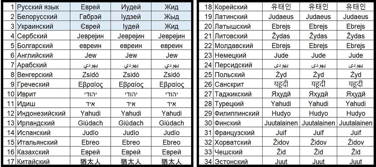 Представляю вниманию читателей список определений, которыми оперируют носители разных мировых языков в отношении представителей одного народа, который сейчас занимает первые полосы мировых СМИ, вытеснив украинские события, как минимум, на второй план. В качестве вступления поясню: отношение к прочитанному может быть разным: от жёстко негативного (я с ним сталкивался), через нейтральное и до исключительно позитивного (не для всех, конечно). Поехали. Определение представителей еврейской нации в языках мира: Вполне допускаю, что в представленной иллюстрации могут быть ошибки и неточности, ибо технический перевод. Но суть, полагаю, от этого не изменится ни на йоту. Итак, хорошо видно, что только русский, белорусский и украинский языки, как наиболее близкие, дают максимально широкое определение отдельных групп народа Израиля, проводя чёткую границу между национальностью, религиозной принадлежностью и ментальными особенностями. На мой взгляд, это позволяет носителям только наших языков не п