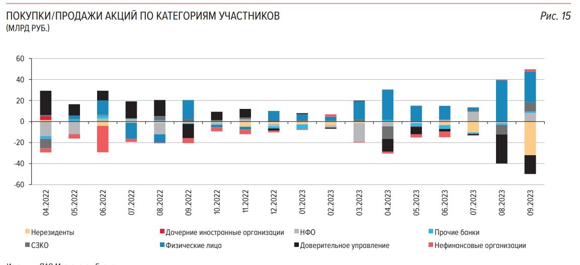 Сентябрь 2023 года был ознаменован самой активной распродажей российских акций нерезидентами за последние 1,5 года (с февраля 2022). Речь в данном случае идет о нерезидентах из "дружественных" юрисдикций, поскольку для "недружественных" доступ к торгам закрыт. Они выступили крупнейшими нетто-продавцами на Мосбирже, ну а их покупателями, в основном, выступали физлица-резиденты. Это следует из свежей отчетности Центробанка. Желтый столбец внизу графика и показывает нетто-продажи нерезидентов, которые составили в сентябре рекордные 32 млрд рублей. Как видно на общем графике, в июле (второй по объемам продаж месяц за весь период), их нетто-продажи были более чем в 3 раза меньше. Также, для сравнения, за предыдущие 8 месяцев текущего года нетто-продажи нерезидентов составили 22,8 млрд рублей, а тут только за 1 месяц - 32 млрд. Что-то такое нехорошее почувствовали в российском рынке зарубежные инвесторы именно в сентябре, поскольку так активно пожелали избавиться от принадлежащим им бумаг. Ч