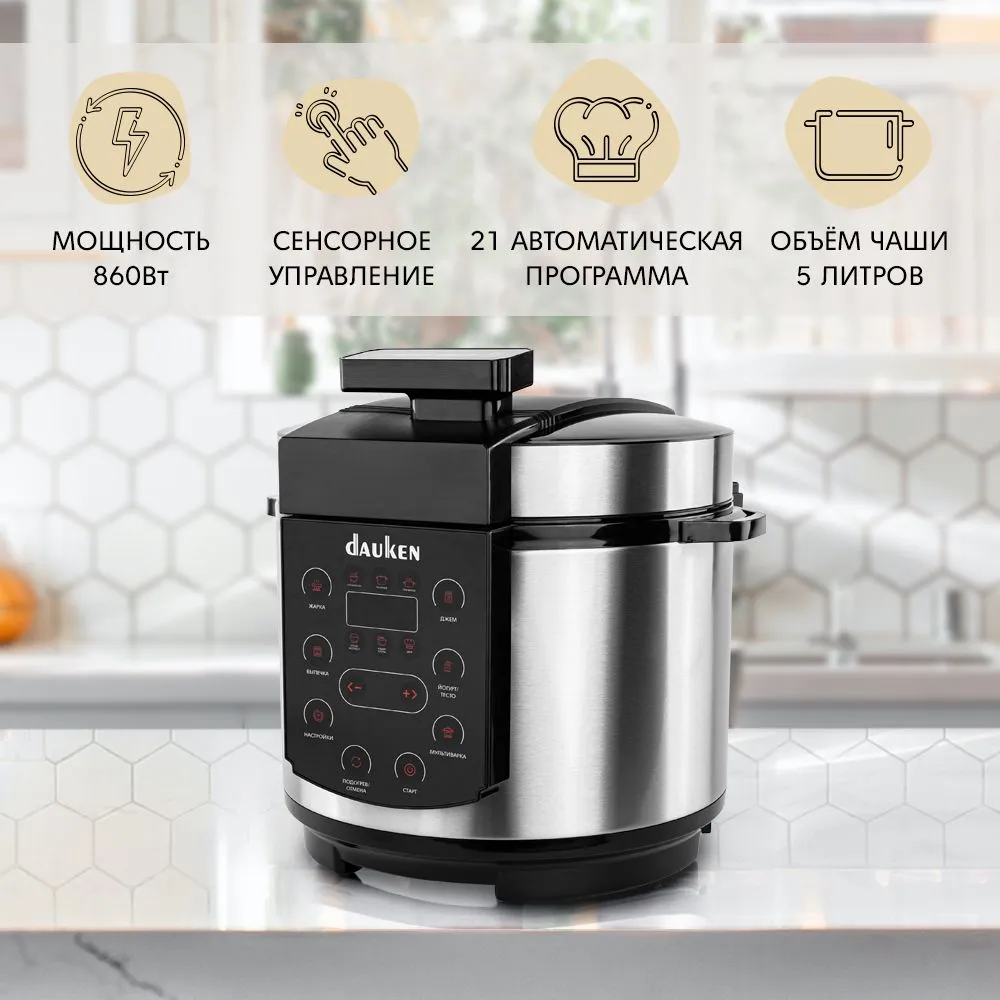 Шеф-повар на вашей кухне. Сложно представить себе современную кухню без такого нужного девайса как мультиварка. В многообразии марок легко запутаться. Выбирают обычно по трем показателям: количество программ, тип чаши и дизайн. Представляем мультиварку Dauken DMC101, которая, уверены, подойдёт вам по всем этим параметрам и не только. С первого взгляда: Мультиварка, бесспорно, должна быть эргономичной и с удобным управлением. С этим у Dauken DMC101 всё в порядке: она достаточно компактная, с плавными контурами, на передней панели располагается большой дисплей с сенсорной системой выбора программ. Управление легким касанием - это очень удобно и экономит время. Корпус прибора выполнен из тонкой листовой стали, а значит, устойчив к повреждениям и прост в уходе. Что внутри? Пятилитровая керамическая чаша с антипригарным покрытием позволяет готовить со сниженным количеством масла, а значит, ваша еда станет более полезной. Равномерный нагрев по всей поверхности чаши - залог всегда удачных бис