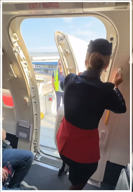 Стюардеса_Закрывает дверь самолёта Boeing 757 бортпроводник авиакомпании AZUR