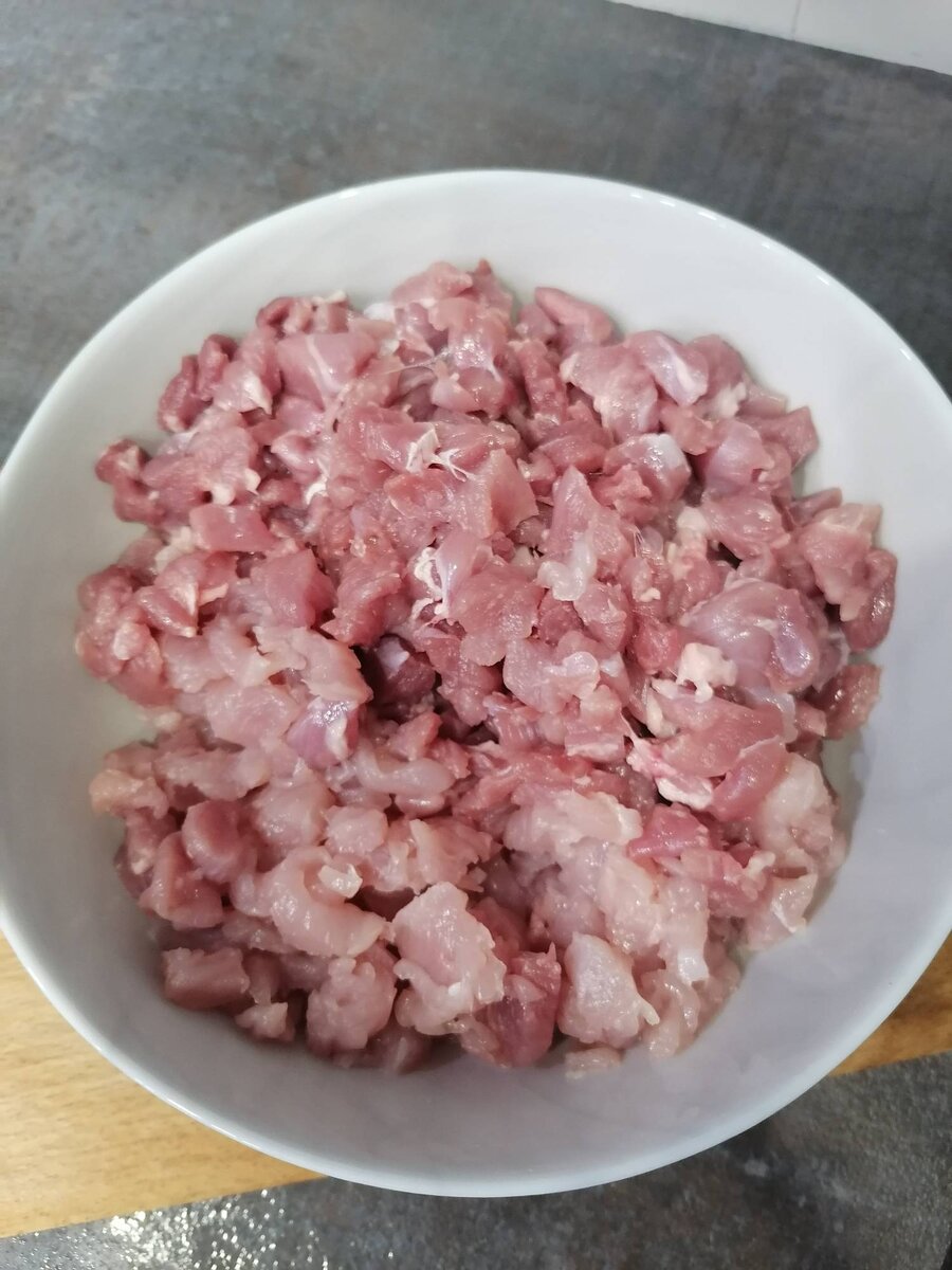 Мясо нарезать на мелкие кусочки. Добавить лук или чеснок (по вкусу).