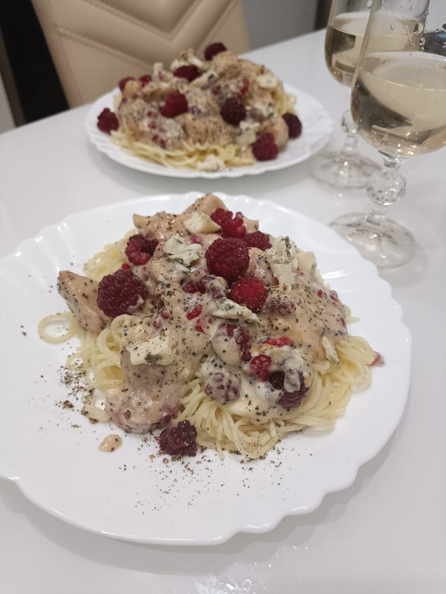 Даааа, это просто сумасшедшее блюдо! Нежнейшие кусочки курицы в сливочном соусе, малина, мак и сыр , да ещё и в сочетании со свежими спагетти - это просто фантастика. НАДО: