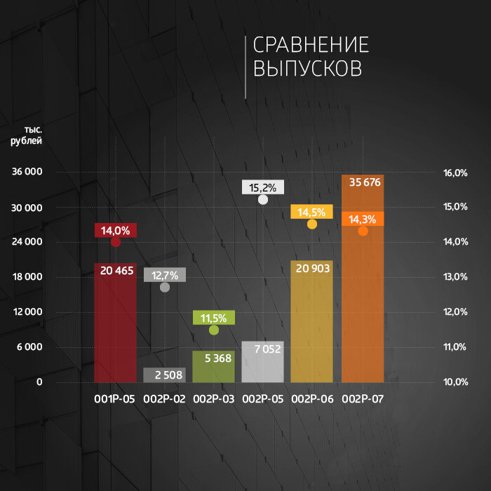 Суммарный объем торгов по шести биржевым выпускам эмитента составил 92 млн рублей. Сравнение выпусков за неделю Выпуск облигаций АО «Коммерческая недвижимость ФПК «Гарант-Инвест» серии 002Р-07 объемом 4 млрд рублей продолжает выкупаться высокими объемами, что указывает на сохранение интереса к бумагам эмитента со стороны институционалов. Максимальная объем торгов был зафиксирован в понедельник — 543 млн рублей. Всего в период со 2 по 6 октября компания разместила облигации на 790 млн рублей, с момента вывода бумаг на биржу — 2,72 млрд рублей (68%). На вторичном рынке у нового выпуска также всё хорошо: среднедневной объем торгов за неделю составил 35,7 млн рублей. Доходность остается на уровне 14,3%, при котировках близких к номинальным значениям (99,9%). Напомним, что дополнительные 0,5% от объема покупки, можно получить через систему Boomerang. Три выпуска эмитента постепенно приближаются к датам погашения: В декабре 2023 г. состоится погашение тела долга выпуска серией 002Р-02 , по к