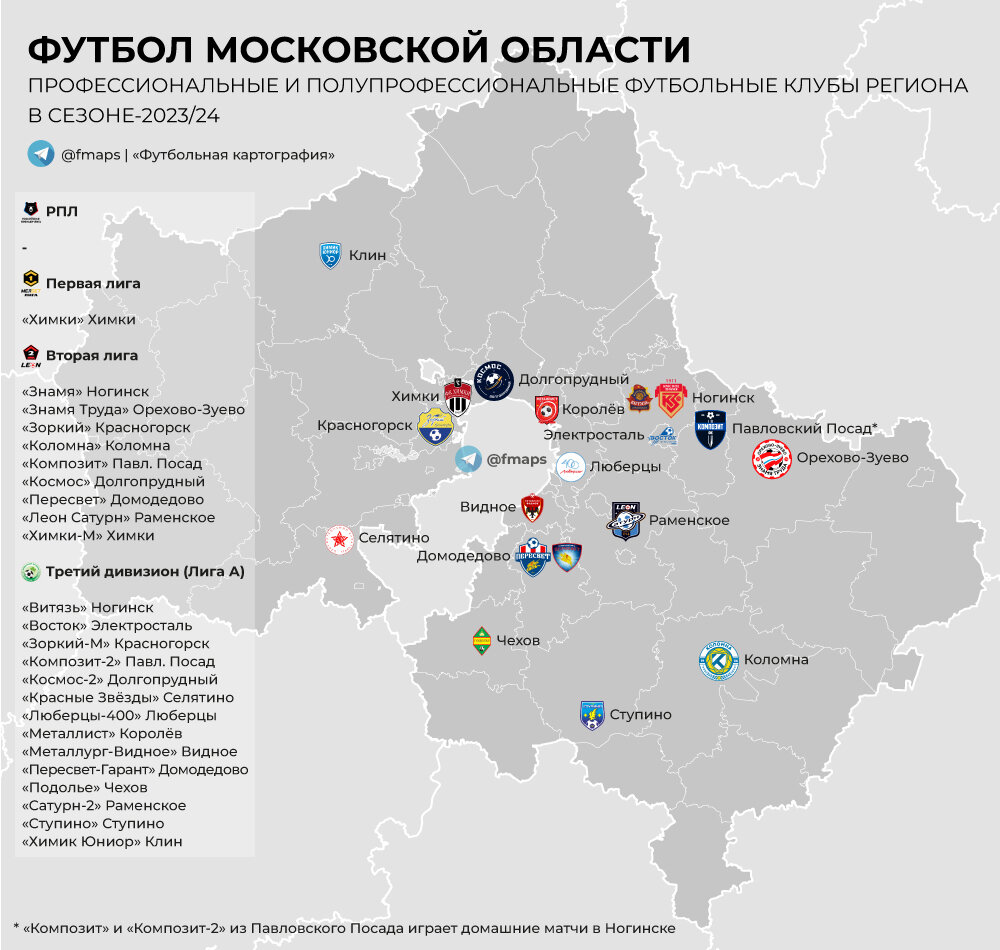 Предлагаю взглянуть на концентрацию команд вокруг Москвы. Именно в столице наибольшее число профессиональных клубов (14): 4 в РПЛ, 2 в Первой и 8 во Второй лигах. Многие проецируют этот факт также на область, хотя в реальности ситуация немного иная. Эту и другие интересные карты и инфографику о футболе вы можете увидеть в Телеграм-канале «Футбольная картография». Подписывайтесь, чтобы не пропустить обновлений! В Московской области 10 профессиональных команд, при этом ни одной нет в РПЛ, хотя долгое время в высшем свете регион был представлен «Сатурном» или «Химками», и только одна в Первой лиге. Для разнообразия я добавил полупрофессиональные/любительские клубы высшей лиги третьего дивизиона для разнообразия покрытия территории, так как почти все профессиональные клубы сосредоточены в городах непосредственно вокруг Москвы. Кстати, так ещё больше заметен перекос в восточном и юго-восточном направлениях. И любопытно, что такая пустота в дальнем Подмосковье на западном и северном направле