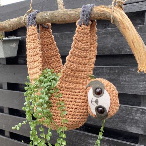 Захотелось начать с симпатичного ленивца. Вязаные кашпо давно в моде, как и вязание игрушек. Тут две идеи соединились.