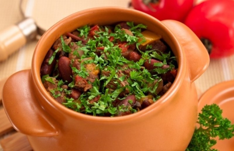 Ингредиенты: 500гр. говядины (свинины, баранины)., 200гр. фасоли., 300гр. помидоров., 300гр. грибов., 200гр. болгарского перца., 150гр. лука., соль., перец., растительное масло. Приготовление: Если вы не любите фасоль, можно её не добавлять. Вместо маленьких горшочков можно использовать форму для запекания с крышкой, объёмом около 2,5л. Из указанного количества ингредиентов получается 5 средних горшков, объёмом 500мл. При подаче посыпьте зеленью-петрушкой, укропом, или зелёным луком. Фасоль замочить на 3-4 часа (лучше на ночь). Отварить фасоль до готовности (точное время приготовления не подскажу, разные сорта фасоли варятся по разному). Лук мелко нарезать. Мясо нарезать небольшими кусочками. Грибы нарезать небольшими ломтиками. Перец очистить от семян, нарезать соломкой. Помидоры нарезать кубиками. На растительном масле обжарить лук. Добавить мясо, немного обжарить. Добавить грибы, посолить, поперчить. Добавить перец, жарить 5 минут. Добавить помидоры, жарить 2-3 минуты. В горшочки