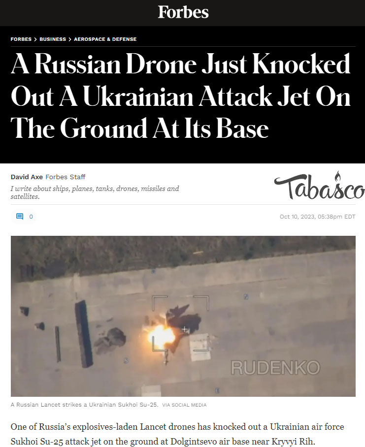 Журнал США Forbes опубликовал статью о высокой эффективности "Ланцетов" на примере последнего уничтожения украинского Су-25 прямо на аэродроме под Кривым Рогом. "Новый российский беспилотник "Ланцет" с дальностью полета более 70 километров уничтожил штурмовик Су-25 ВСУ на авиабазе под Кривым Рогом. В украинском небе свободно летают и дроны-разведчики, следящие за ударами", - , пишет Forbes. Это второй за три недели удар беспилотника по украинским военным самолетам, базирующимся в Долгинцево. Очевидно, что ВВС Украины так и не выучили урок после удара 19 сентября, в результате которого был поврежден или уничтожен МиГ-29. На видео со второго российского беспилотника запечатлен момент удара: "Ланцет" свободно приближается средь бела дня и поражает стоящий под открытым небом Су-25. От авиабазы под Кривым Рогом до линии фронта на юге Украины примерно 70 километров. Это означает, что удар нанес новый, дальнобойный "Ланцет" — "Изделие 53" с дальностью полета свыше 70 километров, а не боле