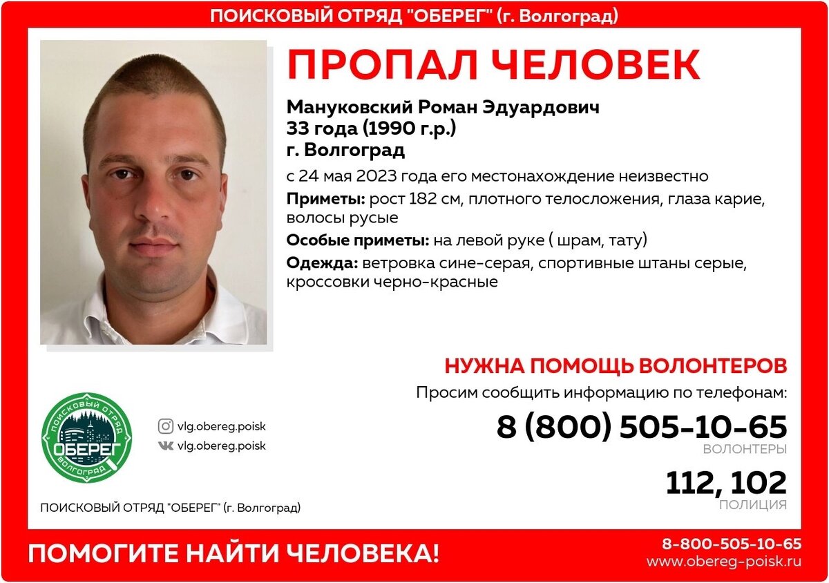 В Волгограде будет организован повторный масштабный поиск 33-летнего Романа Мануковского, который пропал еще в мае. Подробности сообщил руководитель поискового отряда «Оберег» Владимир Король. Известно, что молодой мужчина 24 мая просто вышел из дома и не вернулся. Никаких дополнительных обстоятельств его исчезновения нет. В минувшее воскресенье волонтеры уже собирались на поиски мужчины, но тогда сильно подвела погода, и небольшому количеству людей удалось прочесать очень маленькую территорию, поэтому назначен новый сбор. В нем примут участие сотрудники полиции и следователи. Всех желающих ждут в 9 часов 13 октября на улице Николая Отрады 4А возле гаражных боксов в Тракторозаводском районе. В отряде просят позвонить им заранее, чтобы сформировать группы. С собой лучше взять чай и перекус, также стоит тепло и удобно одеться. О Романе известно, что он — профессиональный пловец, получил специализацию по гребному спорту в Волгоградской академии физической культуры кафедры водных видов спо