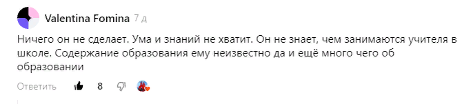 Часто обсуждаем проблемы школьного образования и спорим. Но мы взрослые люди. Родители ругают школу. Учителя ругают родителей. Автор пытается не то чтобы примирить враждующие стороны, но показывает, к чему это ведёт и пытается объяснить, что ни родители, ни учителя в проблемах школы не виноваты. Привожу разные примеры из комментариев и из жизни. Обсудим)) Родители и учителя сейчас находятся по разные стороны. Кто задумывается и вникает в происходящее в школах, понимает, что это не выход. Но многие не понимают и продолжают ругаться и обвинять друг друга. Вроде как все стараются сделать как лучше, но к большому сожалению, этого у нас и не получается. Минпрос постоянно что-то вводит новое, а учителя не понимают, сколько ещё можно закручивать им гайки. Ведь и так уже все работают на износ. Продолжаем искать виноватого. В комментариях обвиняют учителей, почему они не протестуют, не пишут коллективные письма, не звонят в колокола, образно говоря. Один читатель ответил так. И автор с ним пол