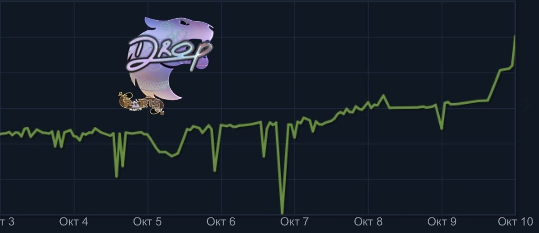 Я уверен, что большинство слышало о том, что различные наклейки, разных годов, связанные с определёнными турнирами дорожают с годами. Поэтому здесь я постараюсь внести больше конкретики относительно выбранных мной наклеек. Хотелось бы сегодня рассмотреть два стикера. Один из них с турнира прошлых лет и один с совсем недавнего, Парижа. Первый стикер - Наклейка | drop (holo) | Париж 2023 Текущая стоимость на момент написания статьи - 600 рублей.