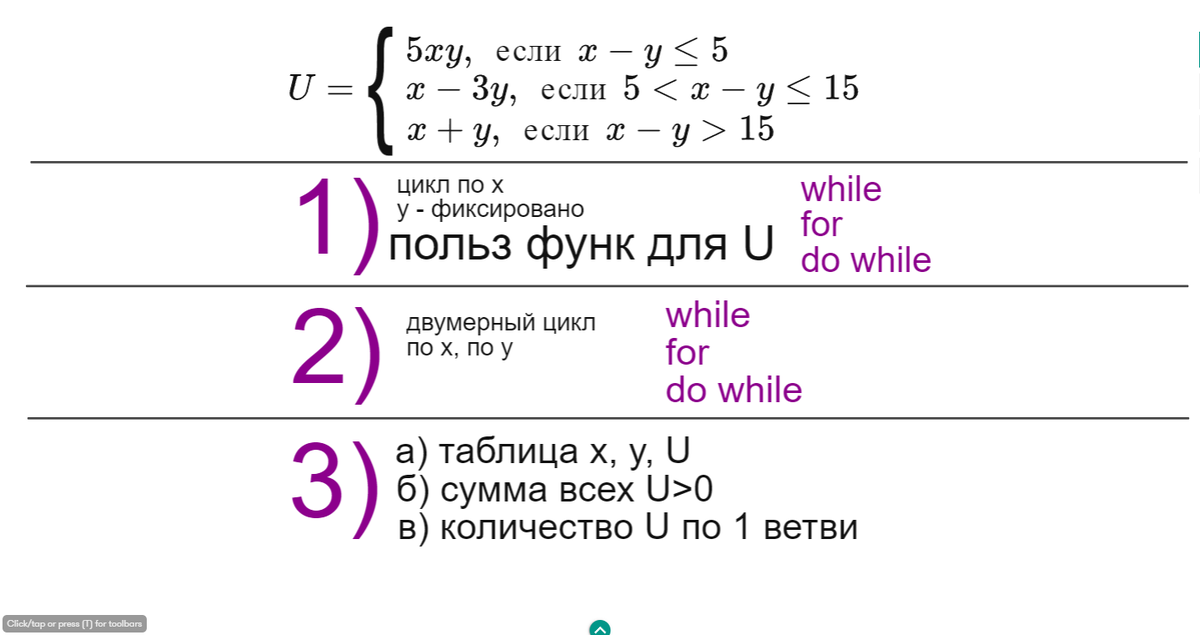 Для вывода таблицы в С++ использовать функцию printf(). при 1 ≤ x ≤ 10 с шагом hx = 3 и y = 2,156 Блок-схема с предусловием (для программ с операторами while, for): Программа С++ с оператором while: Программа С++ с оператором for: Программа Mathcad через ранжированную переменную: Программа Mathcad с оператором while: Программа Mathcad с оператором for: Блок-схема с постусловием (для программы с оператором do while): Программа С++ с оператором do while: Программа MS Excel (OO Calc) в режиме чисел: Программа MS Excel (OO Calc) в режиме формул: ЗАДАЧА 2 Вложенный цикл (двумерный цикл) Постановка задачи.