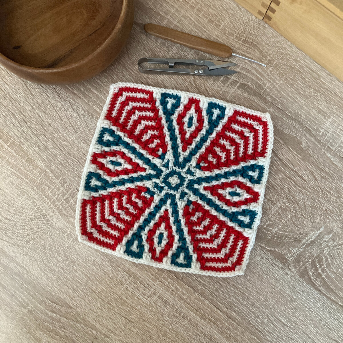 Ничего такого в сети не нашла: как вязать мозаику крючком тремя цветами пряжи, поэтому "смешала" мозаичную технику и жаккардовую (всё, что смогла придумать). Не знаю, на сколько это правильно, не правильно, но мне понравилось: и сам процесс вязания и результат. Вот теперь думаю, как добавить четвёртый цвет в мотив.