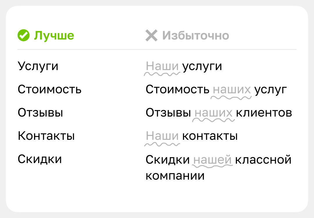 На многих сайтах есть такая болезнь — избыточное использование слова «наш». Это удешевляет компанию и выдаёт новичков в дизайне. Попробуйте написать короче: Нет никакого криминала в том, чтобы разок уточнить «нашесть». Но если использовать приём слишком часто, можно усложнить себе жизнь: Если нужно создать впечатление надёжности или продать услугу дороже, с «нашими услугами» это будет на 1% сложнее Это лишь первый шаг к хорошему тексту. Вместо сухой подписи в заголовок можно вынести факт о компании или преимущество. Об этом расскажу в другой раз Если сделать лучше надо здесь и сейчас — избавьтесь от повторений, не бойтесь коротких заголовков Читайте меня в Телеграме: @yzalex_ru