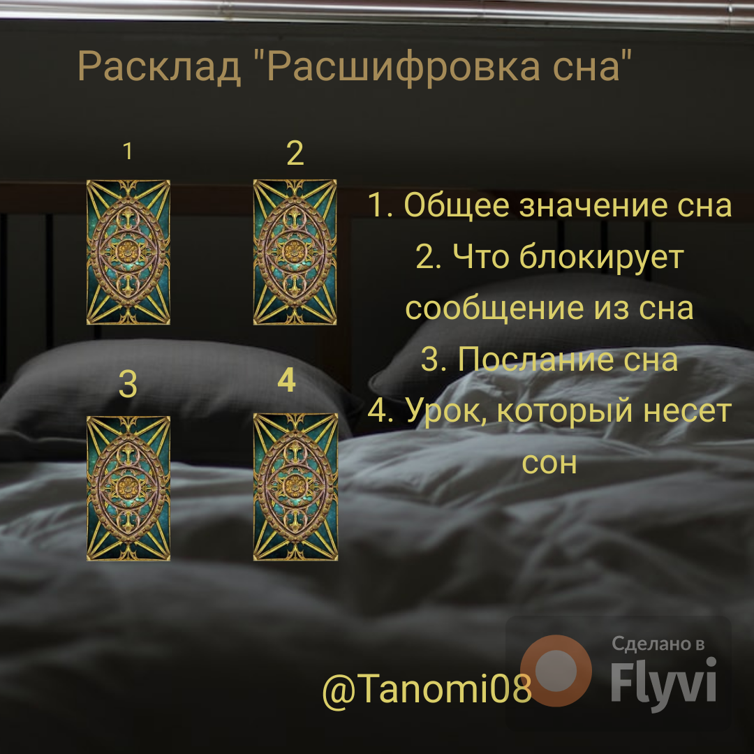 Ко мне часто обращаются с запросом о расшифровке сне. Иногда я могу просто рассказать про сон и что он значит, но можно прибегнуть к Таро. Для этого у меня есть расклад. Схема расклада "Расшифровка сна" ............1................................2............ ...........3................................4............... 1. Общее значение сна Эта карта укажет на то, что происходит в данный момент. Это будет предупреждением о надвигающейся потере, важном решении, которое необходимо принять, возникающей ситуации, с которой необходимо разобраться, или чувствах и эмоциях, которые испытывает сновидец и которые вызывают беспокойство. 2. Что блокирует сообщение из сна Эта карта укажет блоки или какие то ситуации, которые мешают нам понять, о чем был наш сон. 3. Послание сна Здесь мы увидим, что несет наш сон, почему он приснился и о чем хочет предупредить. 4. Урок, который несет этот сон Здесь мы увидим, для чего этот сон и какой урок мы должны из него вынести. Пример расшифровки раскла