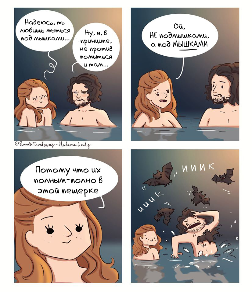 Эпопея «Игры Престолов» не оставила равнодушным ни одного зрителя. Симпатии разделились на тех, кто «за» Джона Сноу и тех, кому небезразлична судьба Дейнерис Таргариен, той самой Матери Драконов. Без преувеличения, замечательная киносага закончилась, но оставила много вопросов. На некоторые ответит талантливая художница Сара Данлэйви. Ее взгляд на героев и сюжет нашумевшего сериала отличается изрядной самобытностью. Комиксистка переносит события в современную реальность и наслаждается поведением персонажей в новом мире. Делает это Сара с ювелирной точностью и немалой долей едкого сарказма. Сара Данлэйви (Sarah Dunlavey), она же Мадам Леди – что о ней известно Несмотря на «всезнание» сети, о Саре известно немного. По крайней мере, нет информации о месте, времени рождения, учебы и прочих подробностей. Поклонники смогли проведать, что впервые канадская художница из Монреаля выложила свои работы в Интернет в 2016 году, взяла псевдоним Мадам Леди и принялась наполнять сеть потрясающими по ю