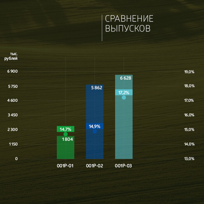 Суммарный объем торгов по трем биржевым выпускам эмитента составил 14,3 млн рублей. Сравнение выпусков за неделю 28 сентября началось размещение трехлетнего выпуска ООО «Группа «Продовольствие» серии 001P-03 объемом 300 млн рублей и ежемесячной выплатой купона по ставке 16% годовых на весь период обращения. На первичном рынке выпуск имеет хороший спрос — дневные объемы выкупа не опускаются ниже 1 млн рублей, а суммарно размещено бумаг почти на 50 млн рублей (17%). На вторичном рынке облигации показывают стабильную ликвидность, среднедневной объем торгов на прошлой неделе держался на уровне 1,3 млн рублей, а суммарный объем за неделю был максимальным (6,6 млн рублей) среди все выпусков эмитента. Выпуск серии 001P-02 завершил торги на прошлой недели с котировкой 100,4%. Суммарный объем за пять дней составил почти 6 млн рублей (размещенный объем 170 млн рублей), что на 44% выше показателя предыдущей недели (4,1 млн рублей). По выпуску 6 октября прошла выплата купона по ставке 15% годовых.