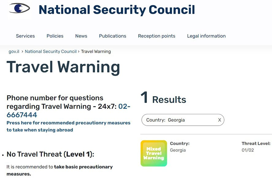 Совет национальной безопасности Израиля предупреждает путешественников о риске поездок в различные государства. Практически всей территории Грузии присвоен уровень 1 – это значит, что угроз нет, израильтяне по-прежнему могут спокойно отправиться в эту страну.