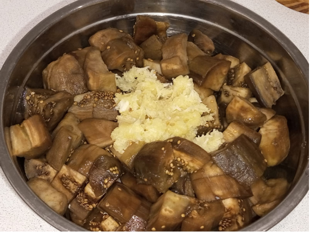 Хочу предложить два варианта таких баклажанов просто с чесноком, чесноком и смесью для шашлыка. Данные рецепты только мои, если увидели подобные рецепты, значит, они взяты отсюда. В прошлом году такие баклажаны не сделала и очень пожалела зимой. Баклажанов можно использовать и меньшее количество. Ингредиенты на 2,5-3 килограмма баклажанов. - баклажаны; - чеснок – 1 очищенная головка; - масло растительное – 4 ст. ложки; - приправа для шашлыка – 1 чайная ложка; - вода – 2 литра; - соль – 2 ст. ложки; - сахар – 1 чайная ложка; - уксус 70% - 2 чайные ложки. Баклажаны среднего размера промываю, просушиваю, запекаю в разогретой духовке при 200 гр. 15-20 минут до полуготовности, важно чтоб баклажаны внутри остались сыроватыми, готовность проверяю зубочисткой. Если баклажаны разного размера, меньшего размера вынуть из духовки раньше. Запеченные баклажаны очищаю, нарезаю на крупные кусочки как на фото. Далее раскладываю в две разные емкости, в которых будет удобно перемешивать. Очищенную головк