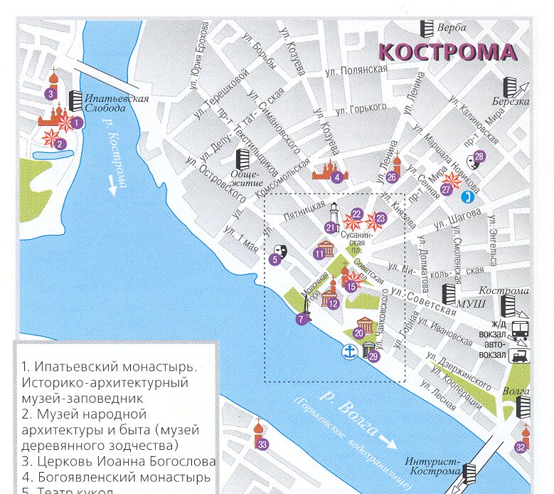 В книге «Дорога Домой» я даю много расшифровок названий городов Золотого кольца и их назначения с точки зрения сил для России, в том числе и для Костромы. Золотое кольцо вообще скопище сил. Я взял план города и отметил на нем точками церкви и монастыри (они всегда ставятся на местах силы) – получилось два треугольника – два костра. Далее, проведя линию, соединяющую вершины треугольников, я получил основание для третьего, не проявленного треугольника, обозначенного на рисунке пунктиром. Это малый треугольник обозначает не рождённого ребёнка – не рождённую новую жизнь. Его формирует Сусанинская площадь и два пустыря на набережной Волги – три пустыря