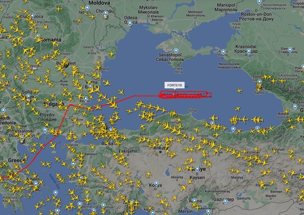 Разведывательный беспилотник НАТО американского производства с позывным FORTE 10 вылетел с авиабазы в Сицилии, целенаправленно пролетел через Грецию и Болгарию и стал нарезать круги над Чёрным морем, собирая информацию.