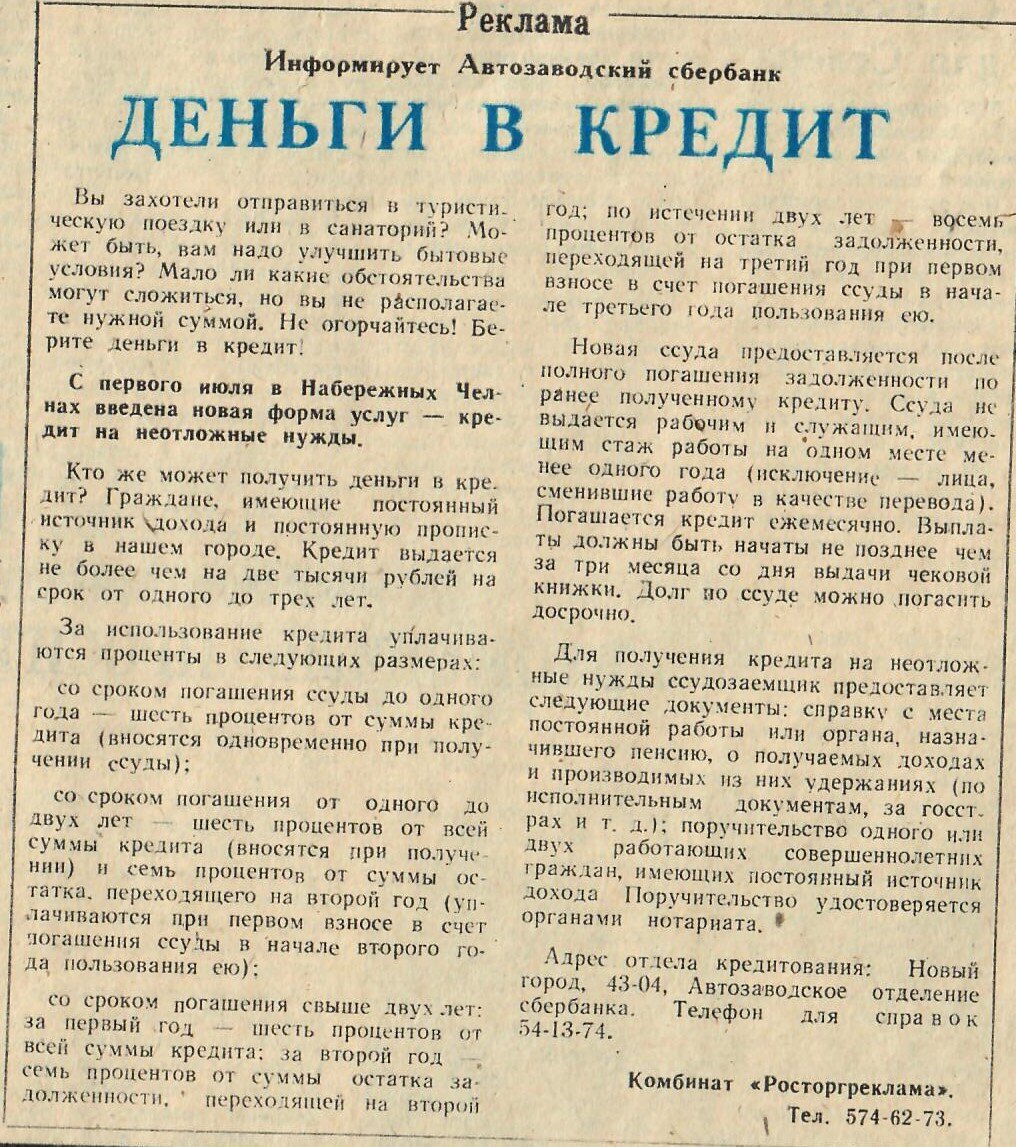 Знаете ли вы, что жителям города Набережные Челны в 1988 году банки впервые стали предлагать денежные кредиты на неотложные нужды. И первым это сделал Автозаводский Сбербанк. Прочтите рекламный материал из газеты «Рабочий КАМАЗа» от 2 июля 1988 года.