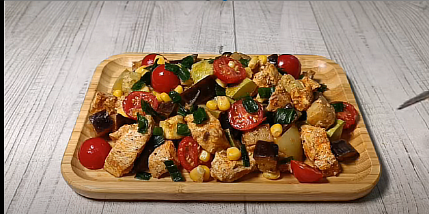 Прекрасное блюдо на гарнир, овощи с мясом. Легкое в приготовлении, простое, доступное и очень вкусное блюдо. Оно не доставит много хлопот, не надо долго стоять у плиты, духовка сама все запечет. А вы порадуете своих близких новым оригинальным блюдом. Готовим! Ингредиенты: 1) Филе куриной грудки, нарезанное средним кубиком - 400 г 2) Кабачок, нарезанный небольшим кубиком - 350 г 3) Баклажан, нарезанный небольшим кубиком - 400 г 4) Перец болгарский, порезанный кубиком - 200 г 5) Масло растительное - 4 столовых ложки 6) Паприка копченая - по вкусу 7) Перец черный молотый - по вкусу 8) Соль - по вкусу 9) Кукуруза консервированная - 150 г 10) Помидоры черри, порезанные пополам - 250 г Приготовление: 1) В миску положить куриное филе, посолить, добавить копченую паприку, две столовых ложки масла из указанных, все перемешать и оставить помариноваться. 2) В глубокую миску сложить кабачки, баклажаны, перец, добавить оставшееся масло, соль по вкусу и черный молотый перец, перемешать. 3) К овощам