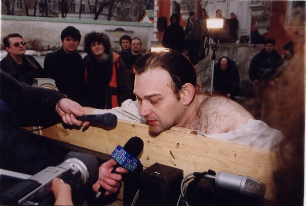 Как искусством стало хулиганством и что нам хотят сказать современные художники своим странным поведением Всем привет. Меня зовут Ольга, вы на канале ТарилаАрт, и сегодня мы обсудим шокирующие и одновременно потрясающие перфомансы современных художников Топ-3 перфоманса, среди которых вы не найдете работ Марины Абрамович, потому что я знаю как и чем вас еще можно удивить! Прежде чем мы начнем, попрошу особо чувствительных отойти от экрана и включить что-то менее шокирующее и будоражащее. И начнем мы с нашего соотечественника и ныне эмигранта художника Олега Мавроматти. Олег стал известным благодаря своей акции под названием «Не верь глазам». В ходе этого перформанса художник был распят на кресте с вырезанной на спине бритвой фразой «Я НЕ СЫН БОГА» на территории Института культурологии Минкульта РФ. Да-да, руки Олега был реально прибиты гвоздями стомиллиметровыми гвоздями. Артист о своей акции говорил: «Я не знаю ни одного артиста в мировом кинематографе, который бы натурально сыграл б