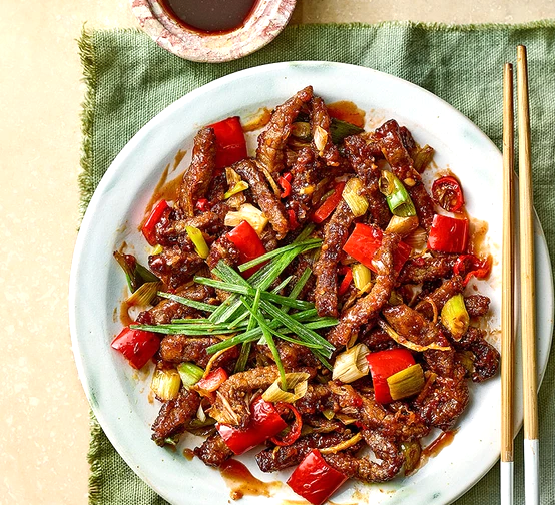 Сначала смешаем ингредиенты маринада в миске. Добавим полоски стейка и перемешаем. Если есть возможность, оставьте в холодильнике на срок до 24 час