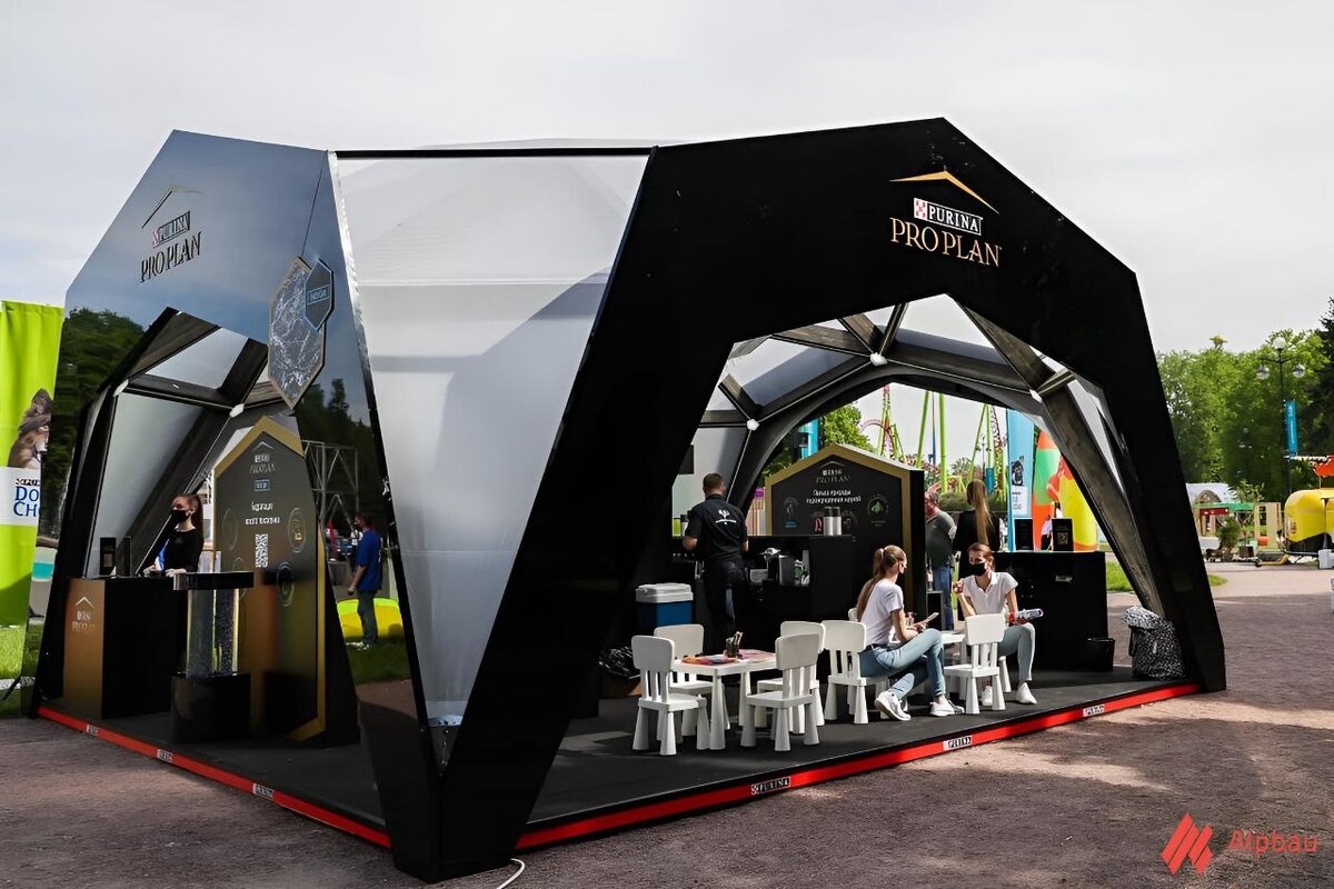 Декорации и вывески легко прикрепляются к каркасу, а на покрытие может быть нанесен абсолютно любой цвет в палитре RAL и практически любой принт. Давайте посмотрим, как наши клиенты применяют конструкции Alpbau. ▫️ Передвижная выставка Purina Pro Plan
